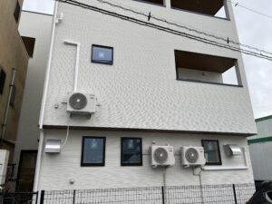 こんにちは!K’sY空調です!本日は、城陽市の方でルームエアコン8台新規取付の依頼で工事させていただきました!1日で終わらず何日間にわたり作業させていただきました。室外機がすべて壁面付けの